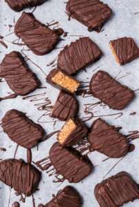 Κόβεις το ρολό σε φέτες και βουτάς κάθε φέτα στη σοκολάτα, τινάζοντάς την καλά για να φύγει όλη η περίσσια σοκολάτα από την επιφάνεια.